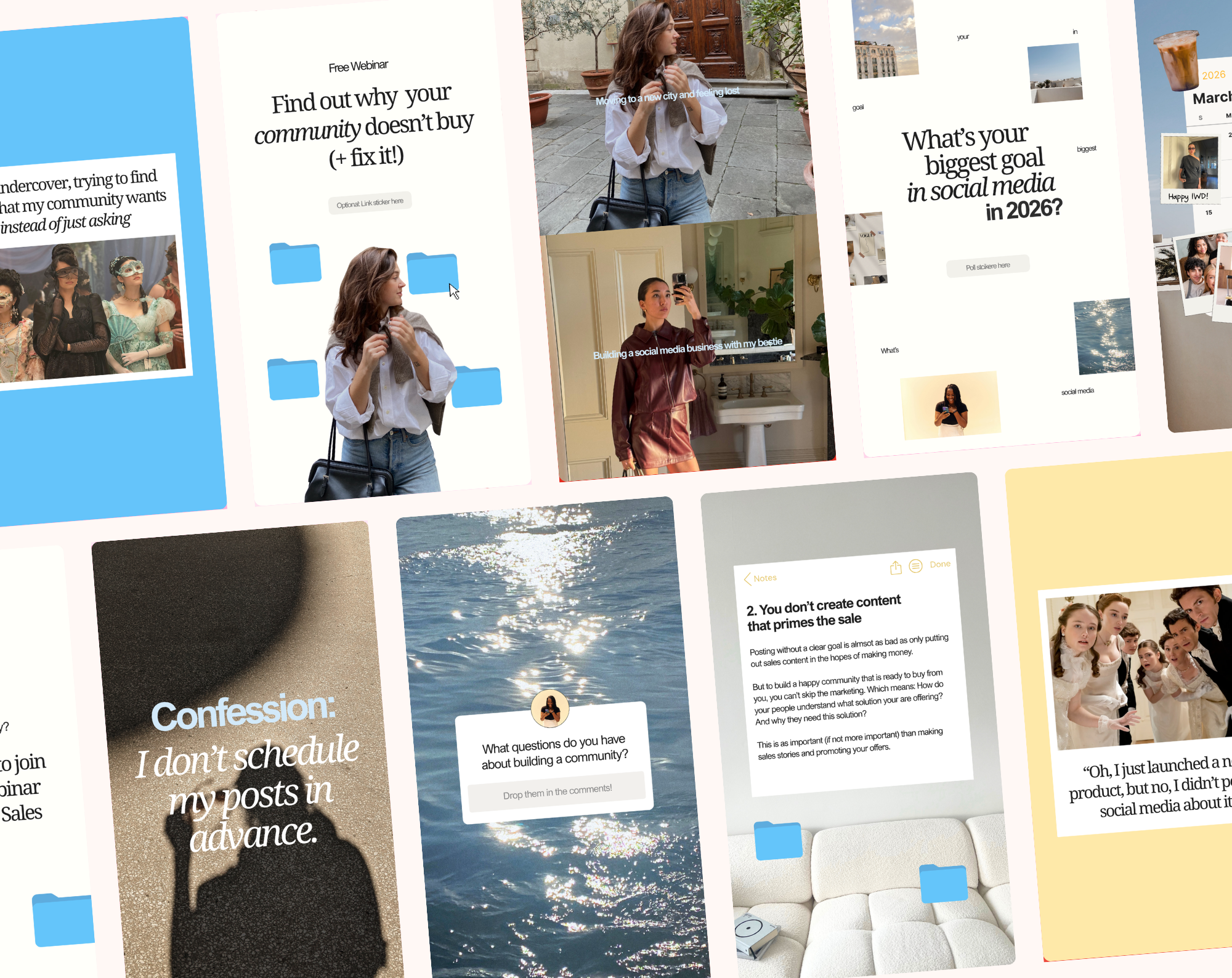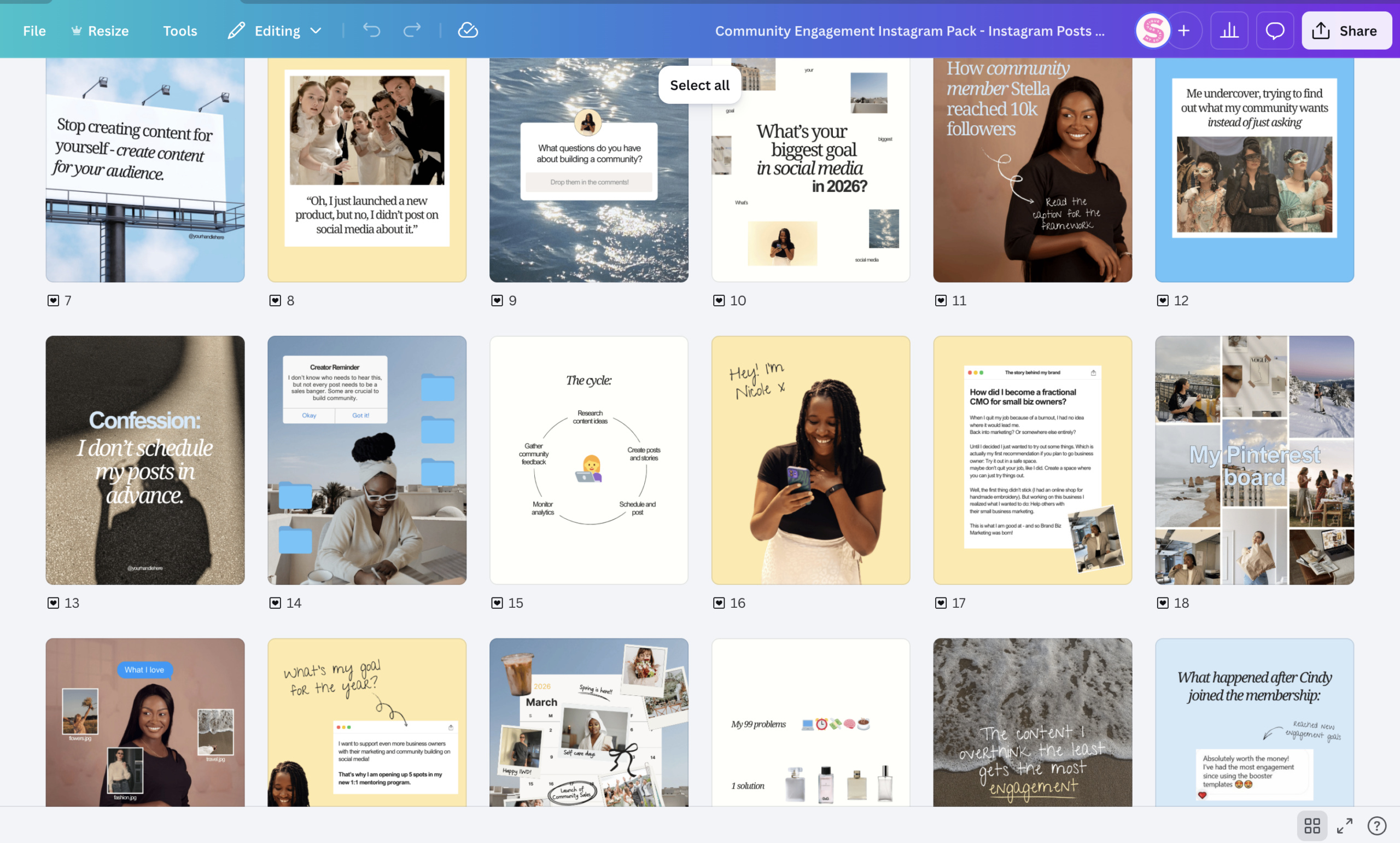 Post, carousel and story templates for more community engagement – done for you in Canva! Get 48 templates to build and grow an Instagram community around your brand.